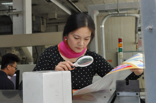 郵票設(shè)計者原藝珊查看郵票印制情況。陸航 攝