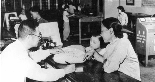 1958年,東四郵局沖破思想的藩籬,在全行業(yè)率先做到“從臺(tái)后到臺(tái)前”,為用戶(hù)提供服務(wù)。圖為東四郵局老“郵務(wù)佐”于洪澤(左一),主動(dòng)轉(zhuǎn)變思想,帶領(lǐng)大家走出柜臺(tái)為用戶(hù)填寫(xiě)單據(jù)。 (資料圖片)