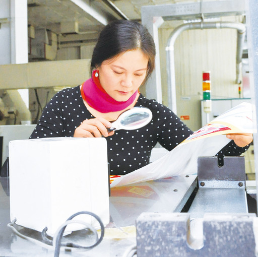 郵票設(shè)計(jì)者原藝珊查看郵票印制情況。 記者 陸航 攝
