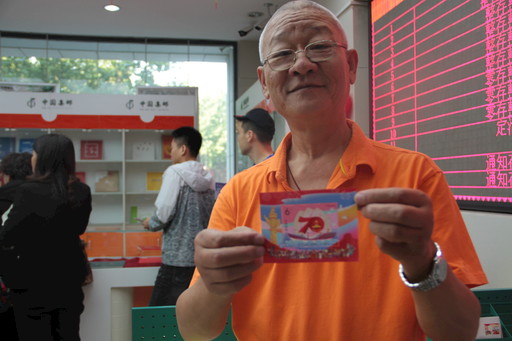 12時(shí)多,會(huì)議室里的集郵愛好者依舊專注地觀看電視直播。“我把‘我和我的祖國’寄語郵資明信片寄給親朋好友,把中國人的這份驕傲傳遞出去?!奔]愛好者王先生購買了很多明信片,并在上面寫下祝福語。