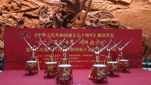 10月1日15時(shí),由中共安徽省委宣傳部、安徽省郵政管理局、安徽省郵政分公司、安徽省集郵協(xié)會(huì)、合肥市文化和旅游局主辦的《中華人民共和國成立七十周年》紀(jì)念郵票首發(fā)暨“壯麗七十年 闊步新時(shí)代”集郵巡展在渡江戰(zhàn)役紀(jì)念館舉行?;顒?dòng)中,安徽省分公司帶來了快閃表演《我和我的祖國》,全場同唱贊歌,歌頌祖國。圖為合肥市郵政分公司員工帶來的《鼓舞盛世 揚(yáng)帆遠(yuǎn)航》表演,強(qiáng)勁有力的鼓聲表達(dá)了慶祝新中國成立70周年的喜悅之情。(徐吉波 攝影報(bào)道)
