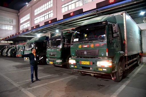 11月11日凌晨,湖北省武漢郵區(qū)中心局調(diào)度員楊成剛忙著指揮車輛進出垛口。 □郝振寧 攝影報道