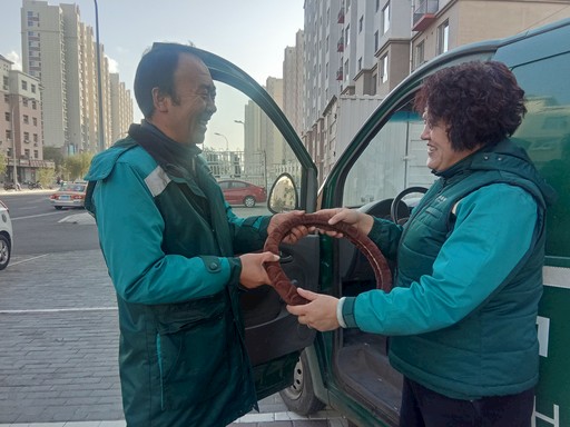 內蒙古自治區(qū)包頭市郵政分公司東河區(qū)分公司惠民攬投部主任邢愛萍(右)為駕駛員聞杰(左)送上了特別準備的保暖方向盤套,為員工的冬季外出作業(yè)提供有效保護?!醢仔氯A 攝影報道