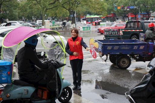12月19日早高峰時段,浙江省樂清市郵政分公司的黨員志愿者走上街頭,開展“文明垂范 志愿先行”活動?!澳茫堊袷亟煌ㄒ?guī)則,非機動車請退至安全線內(nèi)等候紅燈。”黨員志愿者身穿紅馬甲,手持“文明出行你最棒”勸導(dǎo)牌,耐心引導(dǎo)過往行人和非機動車輛遵守交通規(guī)則,勸導(dǎo)不文明交通行為。