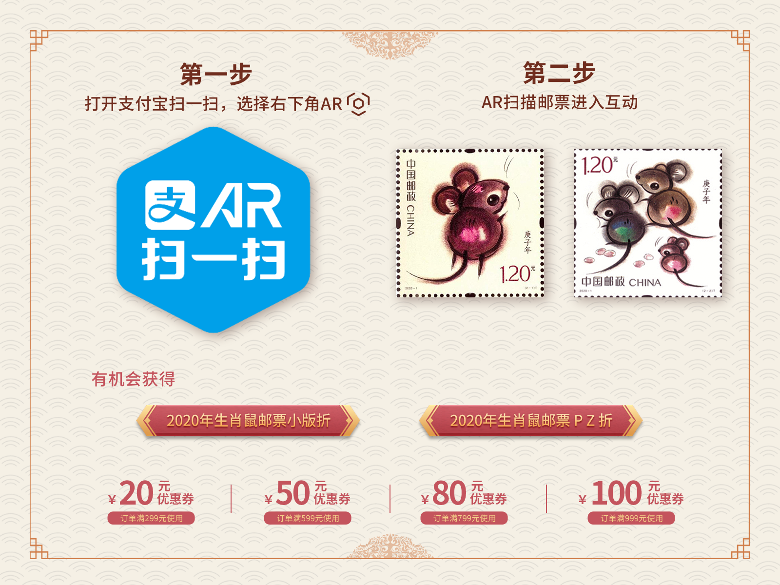 2020年是庚子年,也是我國(guó)生肖郵票發(fā)行40年。今年的《庚子年》鼠年生肖郵票,除了郵票本身,還帶來了非常多的趣味玩法,包括:看AR與生肖鼠互動(dòng)、DIY鼠年郵票送祝福、尋找奇妙博物館里的新年禮物、看直播抽大獎(jiǎng)。讓我們一一揭曉。