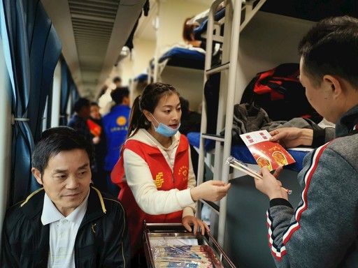郵政志愿者在火車上為老鄉(xiāng)們服務(wù)。