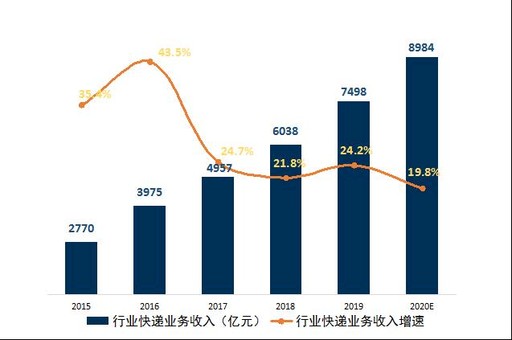 快遞行業(yè)繼續(xù)保持較高增速。2019年,全國快遞服務(wù)企業(yè)業(yè)務(wù)量累計完成635億件,同比增長25.3%,業(yè)務(wù)收入累計完成7498億元,同比增長24.2%。經(jīng)測算,預(yù)計2020年快遞行業(yè)業(yè)務(wù)量約為771億件,增速為21.3%;業(yè)務(wù)收入約為8984億元,增速為19.8%。(見圖1、圖2)