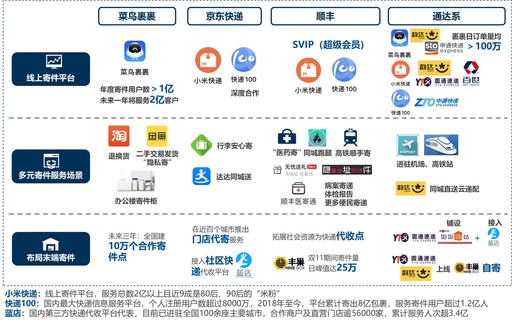 爭奪個人寄件市場,拓展業(yè)務(wù)來源。加快布局線上線下個人寄件流量入口,快遞企業(yè)紛紛接入菜鳥裹裹、小米快遞等第三方線上寄件平臺,并通過官方在線寄件平臺發(fā)力會員營銷;同時,不斷拓展末端自有服務(wù)網(wǎng)點(diǎn)、社會門店(代寄)、線下快遞代收平臺、智能快遞柜等寄件接口。圍繞個人寄件需求布局多元服務(wù)場景,菜鳥裹裹從退換貨延伸到辦公、二手交易等寄件場景,快遞公司圍繞出行、本地生活、就醫(yī)等場景推出全新寄件產(chǎn)品。(見圖6)