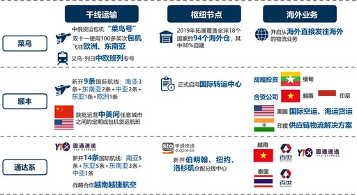 加碼跨境、拓展海外,搶抓國際化機(jī)遇。圍繞周邊國家持續(xù)升級跨境網(wǎng)絡(luò)能力,以開通國際航線、貨運(yùn)包機(jī)、搭載中歐班列等方式,加強(qiáng)跨境干線運(yùn)輸能力,并加大以海外倉為主的境外樞紐節(jié)點(diǎn)建設(shè)。通過“資本運(yùn)作+自建+加盟”方式,聚焦東南亞地區(qū)加速拓展海外本土快遞市場,并推動海外業(yè)務(wù)從快遞向國際貨運(yùn)、供應(yīng)鏈、裝備技術(shù)拓展,如順豐為印度中國企業(yè)提供大型工廠設(shè)備搬遷、零配件及成品交付等供應(yīng)鏈物流解決方案;圓通開始向東南亞輸出物流裝備技術(shù)。民營快遞國際化布局將進(jìn)一步提速。(見圖9)