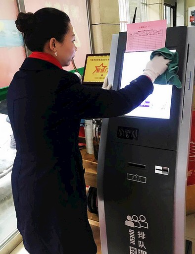 湖南省長沙市岳麓區(qū)郵政分公司日前組織員工對(duì)網(wǎng)點(diǎn)進(jìn)行全面消毒,并在機(jī)具上粘貼“本日已消毒”告示。要求網(wǎng)點(diǎn)每日安排專人負(fù)責(zé)消毒工作,讓郵政客戶放心進(jìn)入網(wǎng)點(diǎn)辦理郵政業(yè)務(wù)。圖為銀盆嶺郵政網(wǎng)點(diǎn)員工對(duì)叫號(hào)機(jī)進(jìn)行消毒?!豕鹚?nbsp; 攝影報(bào)道