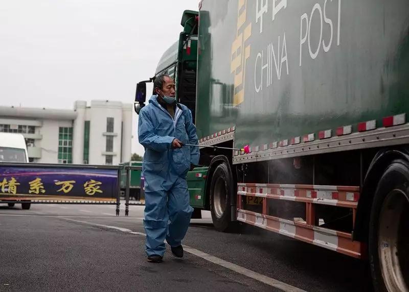 2月1日,武漢郵區(qū)中心局,工作人員噴灑稀釋的84消毒液為郵車消毒。來自全國各地經(jīng)郵政系統(tǒng)送來的救援物資抵達中心局就意味著到達了武漢,從大年三十開始,有專人每天對進出車輛進行噴灑消毒。
