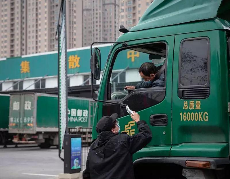 2月1日,武漢郵區(qū)中心局,工作人員為郵車司機測量體溫。