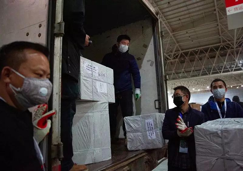 2月1日,武漢國際博覽中心,臨時被征用作倉庫的展廳內(nèi),現(xiàn)場志愿者和郵政工作人員從一輛中國郵政郵車上卸下一批來自杭州的醫(yī)療物資,其中包括PCR檢測系統(tǒng)等醫(yī)療設備。這里匯集了國內(nèi)外援助物資,來自武漢各個投遞點的郵政工作人員常駐現(xiàn)場,協(xié)助對物資進行裝卸、分類和配送。