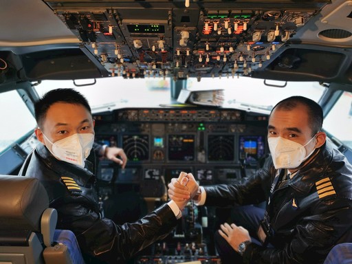 1月27日,黃宏佳(左)執(zhí)飛首班郵航防疫物資寄遞專機,從廣州飛往武漢。詹威東 攝