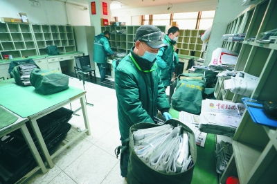 早上7點,侯毅已到崗,按順序整理好要送的報紙、信件,一個大郵包被塞得滿滿的。出發(fā)前,他先給訂戶打電話,有人會到門口來取,有人會讓他放到門衛(wèi)處,還有人會讓他放到小區(qū)統(tǒng)一的暫存點。哪個用戶是什么習慣,他都熟稔于心。臨走,侯毅戴上塑膠手套、護目鏡,全身消毒,兜里隨時揣著一瓶消毒凝膠。