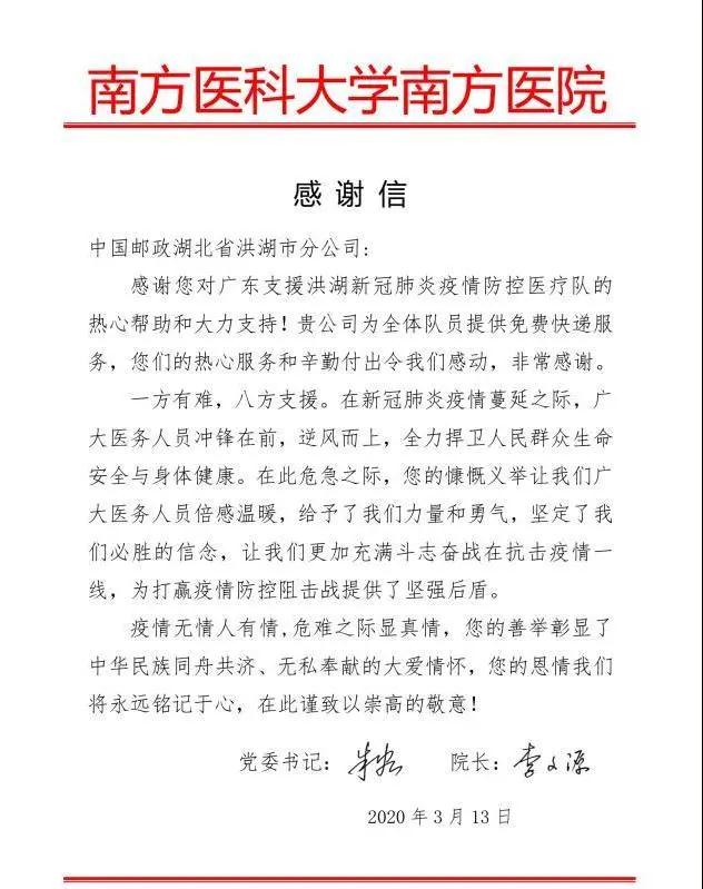 “感謝您對(duì)廣東支援洪湖新冠肺炎疫情防控醫(yī)療隊(duì)的熱心幫助和大力支持!貴公司為全體隊(duì)員提供免費(fèi)快遞服務(wù),您們的熱心服務(wù)和辛勤付出令我們感動(dòng),非常感謝?!?月13日,湖北省洪湖市郵政分公司收到了來(lái)自南方醫(yī)科大學(xué)南方醫(yī)院發(fā)來(lái)的感謝信,近日,他們?yōu)閺V東援鄂醫(yī)療隊(duì)隊(duì)員們免費(fèi)收寄了個(gè)人物資254件,讓醫(yī)療隊(duì)隊(duì)員們能夠輕松平安回家。