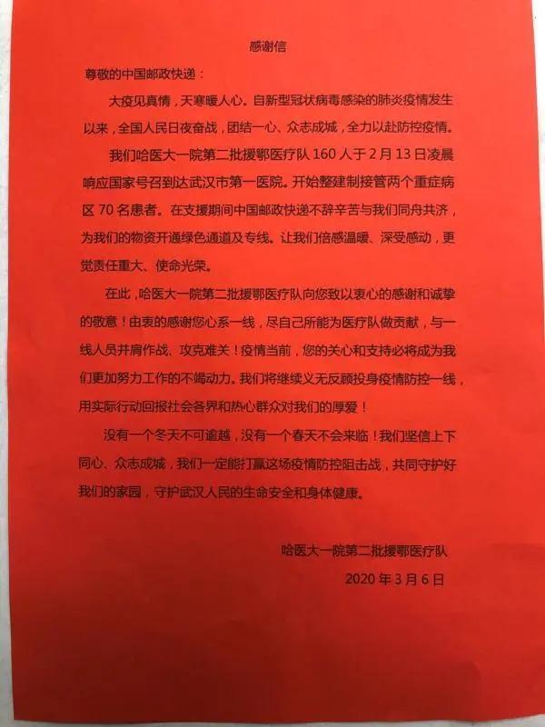 3月6日,哈醫(yī)大一院第二批援鄂醫(yī)療隊(duì)為免費(fèi)寄遞個(gè)人物資服務(wù)向武漢郵政發(fā)來(lái)感謝信;3月11日,唐山、承德、張家口支援湖北醫(yī)療隊(duì)111名醫(yī)護(hù)人員通過(guò)“武漢交通”微信公眾號(hào)發(fā)表了“致敬郵政速遞人員”的文章,對(duì)武漢郵政的服務(wù)表示感謝。