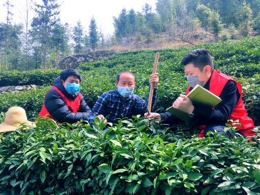 圖為“金融春風(fēng)服務(wù)隊”在茶園了解春茶追肥與生長情況,宣傳郵儲貸款產(chǎn)品?! 趵蠲?nbsp; 攝影報道