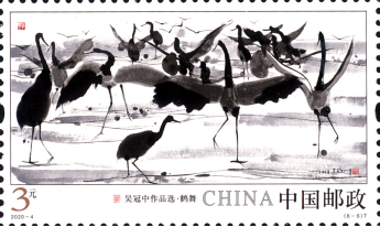 掃描第六圖——鶴舞,伴隨著一陣陣鶴鳴,郵票中的仙鶴動起來了,有的低頭捕魚,有的揮動翅膀,有的上下翻飛,群鶴像是在跳舞一樣?;蝿右幌率謾C,這時群鶴的舞姿更快速了,近處一片片羽毛飄下,遠處幾只鶴沖天直上,翱翔碧空。正是一幅“晴空一鶴排云上,便引詩情到碧霄”的生動畫面。