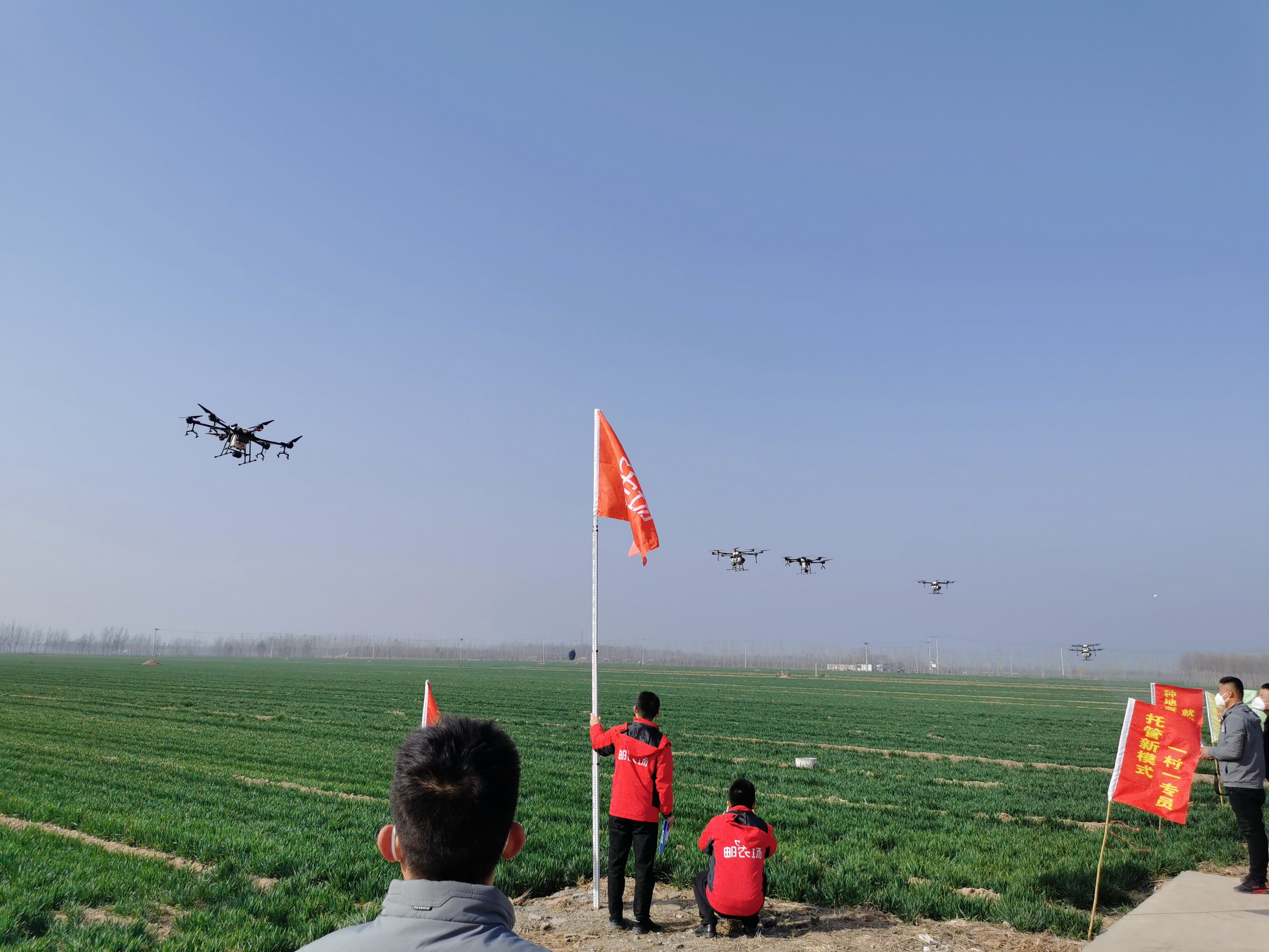 飛防作業(yè)現(xiàn)場,隨著工作人員一聲令下,11架無人機(jī)同時起飛,在技術(shù)人員的操控下穩(wěn)定前行,吸引了不少村民前來圍觀。