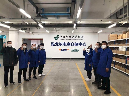 疫情期間進(jìn)駐雅戈?duì)栯娚虃}(cāng)儲(chǔ)中心的郵政員工。