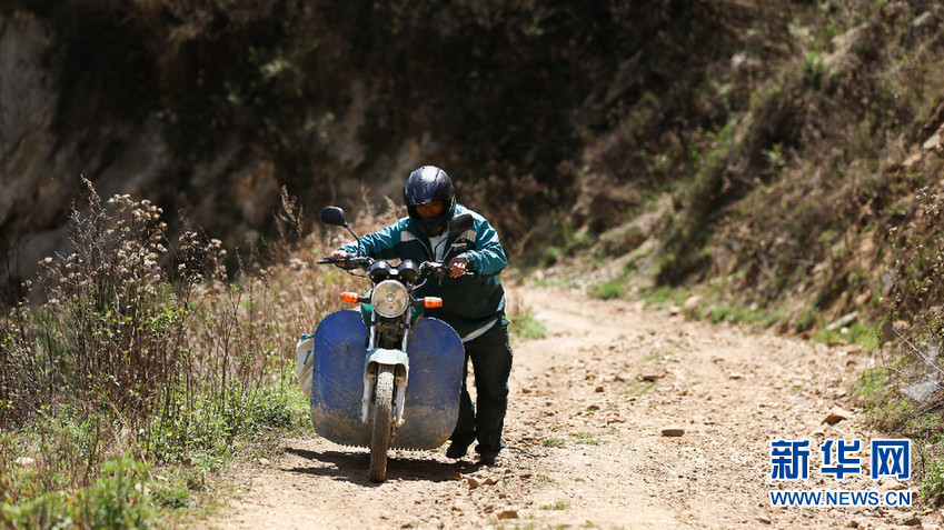 遇到陡坡路段,桑南才推著摩托車前行(5月10日攝)。新華網(wǎng) 趙普凡 攝