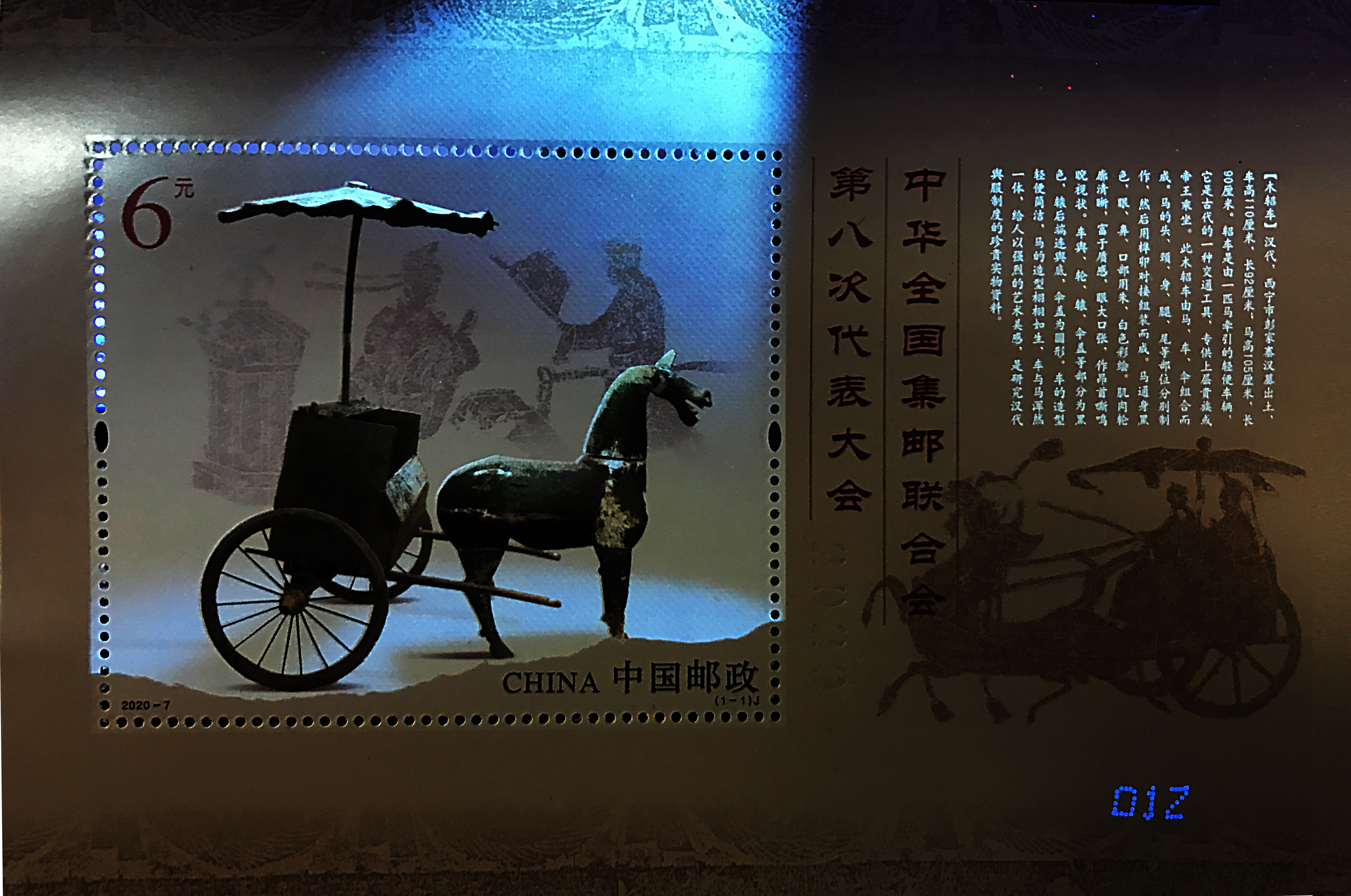 該套郵票由馬立航設(shè)計(jì),北京郵票廠影膠套印工藝印制。在印刷方面突破常規(guī),把平凡的技術(shù),做到極致。采用影寫(xiě)和膠版套印的方式,實(shí)現(xiàn)了傳統(tǒng)印制工藝的組合創(chuàng)新。同時(shí),在紫外光下?tīng)I(yíng)造出博物館內(nèi)的觀賞效果,光線匯聚木軺車,明暗交錯(cuò),仿佛穿越千年歷史。票面上“2020”的印記,記載下集郵聯(lián)八大召開(kāi)的特殊年份。