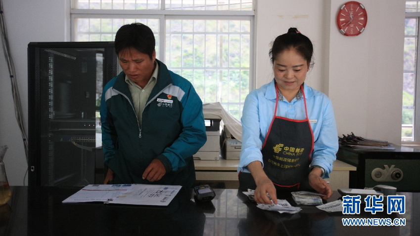 桑南才與妻子蜜曉琴在郵政所收寄郵件(5月11日攝)。(新華網(wǎng) 趙普凡 攝)