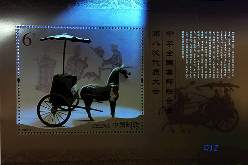 印制后的郵票,不僅在日光下色彩沉穩(wěn)大氣,文物木軺車和馬匹歷經(jīng)歲月洗禮的滄桑盡顯,精準(zhǔn)還原軺車車型,引發(fā)觀者對2000多年前郵運工具的無盡聯(lián)想,而且在熒光燈照射下,更加出彩,只見票面上忽有一束光柱自上而下,灑在木軺車上,車身、馬背在燈光籠罩下泛出光芒,車身、馬身下陰影、光圈斑駁相映,背景的漢代古畫忽然與車馬拉開了距離,似一幅壁畫靜立其后,木軺車瞬間從平面變?yōu)榱Ⅲw,讓觀者仿佛置身于博物館,在射燈光柱下觀賞真實文物。