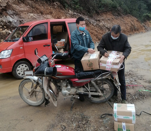 用戶在疫情檢測點簽收包裹。
