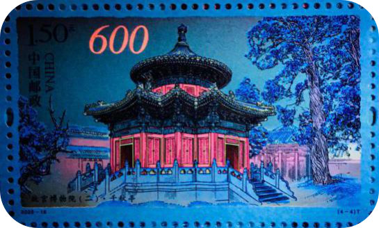 小型張采用特種金油墨印制紋飾圖案,烘托故宮的尊貴大氣。在故宮平面示意圖中的地面部分,專門覆蓋了一層無色變金色珠光油墨和熒光油墨,在特定光照和角度下觀看,地面與建筑層次分明。