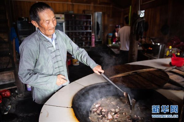 在湘西十八洞村,82歲的施成富在自家的農(nóng)家樂里炒臘肉(6月29日攝)。 新華社記者 陳思汗 攝