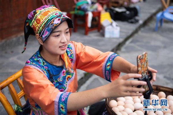 在湘西十八洞村,施林嬌在直播開始前調(diào)整手機(jī)(7月3日攝)。 新華社記者 陳思汗 攝
