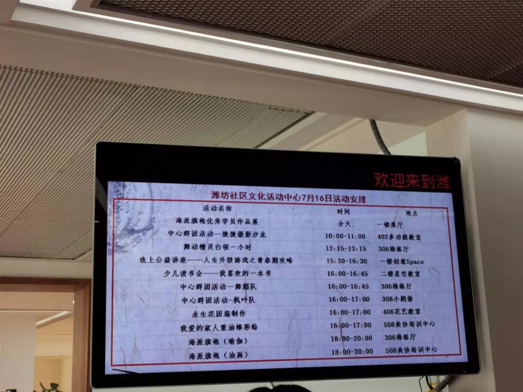 圖為濰坊社區(qū)文化活動中心一樓的電子顯示屏,羅列了當天的各項活動安排。求是記者 侯亞景 攝