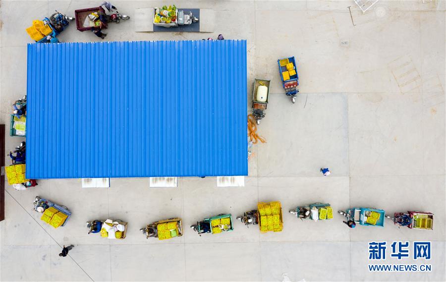在寧夏紅寺堡區(qū)柳泉鄉(xiāng)柳泉村黃花菜晾曬場,村民排隊稱重黃花菜(7月11日攝,無人機照片)。 新華社記者 楊植森 攝