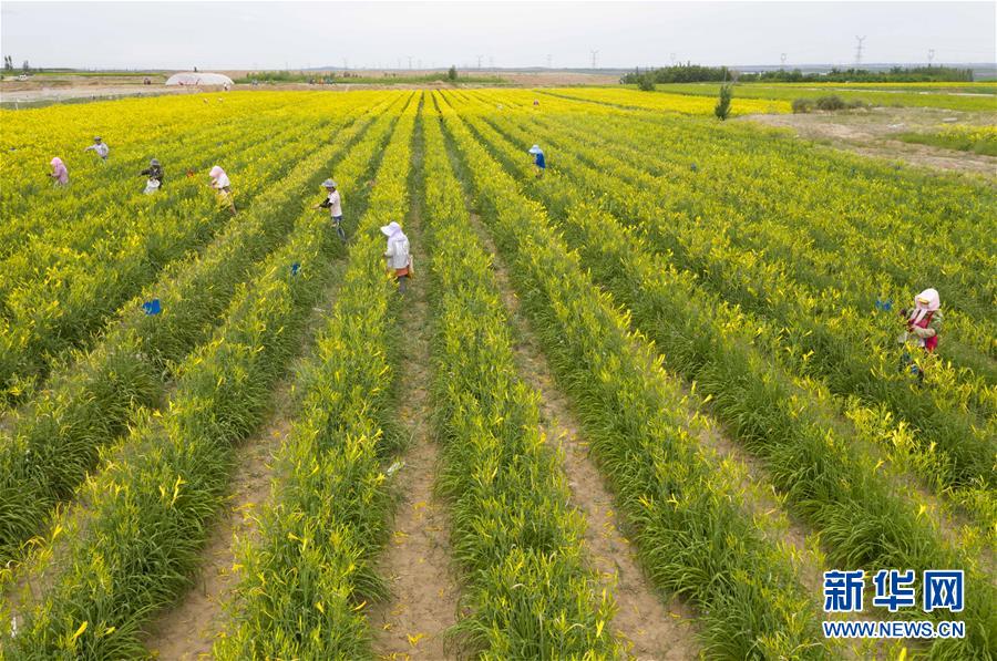 村民在寧夏紅寺堡區(qū)柳泉鄉(xiāng)柳泉村采摘黃花菜(7月11日攝,無人機照片)。 新華社記者 楊植森 攝