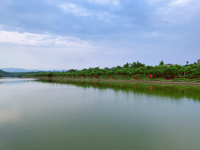 一帶澄澈碧綠的河水緩緩流淌,岸邊樹木蔥蘢、綠草如茵。有畫者在依河寫生,有行者在閑適漫步,不遠(yuǎn)處嘹亮悠長(zhǎng)的嗩吶聲隨風(fēng)飄揚(yáng)。