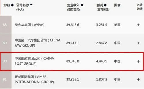 8月10日,《財(cái)富》雜志發(fā)布2020年世界500強(qiáng)排行榜。中國郵政位列第90名,相比去年上升11位,年?duì)I業(yè)收入、利潤均排名世界郵政第二位。