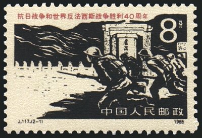 3.新中國(guó)成立后發(fā)行的抗戰(zhàn)紀(jì)念郵票,郵票主圖取材廣泛,圖案名稱多用抗戰(zhàn)史實(shí)名稱來(lái)命名。1952年7月7日發(fā)行的紀(jì)16“抗日戰(zhàn)爭(zhēng)十五周年紀(jì)念”郵票,分別為“盧溝橋風(fēng)云”“平型關(guān)勝利”“歡送新四軍抗日”“領(lǐng)袖策劃反攻”,4枚郵票圖案定格抗戰(zhàn)中4個(gè)有代表性的場(chǎng)景。1965年9月3日發(fā)行的紀(jì)115“紀(jì)念抗日戰(zhàn)爭(zhēng)勝利二十周年”郵票,1套4枚,“毛主席在著作”一圖描繪了毛澤東在延安窯洞里寫(xiě)作《論持久戰(zhàn)》的情景;“八路軍東渡黃河”郵票圖案為八路軍戰(zhàn)士在黃河邊準(zhǔn)備東渡,奔赴抗日戰(zhàn)爭(zhēng)前線的場(chǎng)面;“人民戰(zhàn)爭(zhēng)勝利”主圖為取得抗日戰(zhàn)爭(zhēng)勝利的八路軍、新四軍和游擊隊(duì)?wèi)?zhàn)士在歡呼勝利的場(chǎng)景;“光榮參軍”主圖為人民群眾積極參加人民軍隊(duì),加入抗戰(zhàn)隊(duì)伍的情景。1985年9月3日發(fā)行的J.117“抗日戰(zhàn)爭(zhēng)和世界反法西斯戰(zhàn)爭(zhēng)勝利40周年”郵票,1套2枚,“盧溝橋中國(guó)軍隊(duì)奮起抗日”描繪了抗日戰(zhàn)爭(zhēng)中國(guó)民黨二十九軍將士沖鋒陷陣、奮勇抗戰(zhàn)的英雄形象;“八路軍和民兵戰(zhàn)斗在長(zhǎng)城內(nèi)外”展現(xiàn)了八路軍配合民兵浴血奮戰(zhàn),共同打擊日寇的光輝形象。1995年9月3日發(fā)行的“抗日戰(zhàn)爭(zhēng)和世界反法西斯戰(zhàn)爭(zhēng)勝利五十周年”郵票,1套8枚,分別為“戰(zhàn)火”“臺(tái)兒莊大捷”“百團(tuán)大戰(zhàn)”“敵后游擊戰(zhàn)”“芒友會(huì)師”“華僑捐獻(xiàn)”“臺(tái)灣光復(fù)”“偉大勝利”。分別描繪了盧溝橋戰(zhàn)斗、臺(tái)兒莊大捷、百團(tuán)大戰(zhàn)、敵后游擊戰(zhàn)、芒友會(huì)師的場(chǎng)景,以及華僑捐獻(xiàn)、歡慶臺(tái)灣光復(fù)、日本正式投降簽字儀式的勝利場(chǎng)面。2005年8月15日發(fā)行的“中國(guó)人民抗日戰(zhàn)爭(zhēng)暨世界反法西斯戰(zhàn)爭(zhēng)勝利六十周年”郵票,1套4枚及1枚小型張,“全民抗戰(zhàn)”展現(xiàn)的是國(guó)共兩黨軍隊(duì)和人民群眾并肩作戰(zhàn)的場(chǎng)面;“中流砥柱”主圖為一名八路軍戰(zhàn)士吹響沖鋒號(hào),展現(xiàn)了八路軍在抗戰(zhàn)中的重要作用;“諾曼底登陸”主圖為登陸后手持步槍的美軍士兵;“攻克柏林”主圖為蘇軍歡呼勝利的場(chǎng)景;小型張主圖為一只沖破鐵絲網(wǎng)的白色和平鴿,寓意和平與正義沖破了戰(zhàn)爭(zhēng)的主題。2015年9月3日發(fā)行的“中國(guó)人民抗日戰(zhàn)爭(zhēng)暨世界反法西斯戰(zhàn)爭(zhēng)勝利七十周年”郵票,1套13枚及1枚小型張,郵票圖案背景表現(xiàn)的是中國(guó)抗戰(zhàn)中的13個(gè)經(jīng)典事件場(chǎng)面,主圖是與該事件相關(guān)的紀(jì)念場(chǎng)館:“九一八”歷史博物館、東北烈士紀(jì)念館、中國(guó)人民抗日戰(zhàn)爭(zhēng)紀(jì)念館、上海淞滬抗戰(zhàn)紀(jì)念館、侵華日軍南京大屠殺遇難同胞紀(jì)念館、臺(tái)兒莊大戰(zhàn)紀(jì)念館、延安革命紀(jì)念館、八路軍總部舊址紀(jì)念館、百團(tuán)大戰(zhàn)紀(jì)念館、平型關(guān)大捷紀(jì)念館、冉莊地道戰(zhàn)紀(jì)念館、新四軍紀(jì)念館、滇西抗戰(zhàn)紀(jì)念館;小型張畫(huà)面以《大刀進(jìn)行曲》雕塑為主圖,高度概括、反映了全民抗戰(zhàn)的主題。