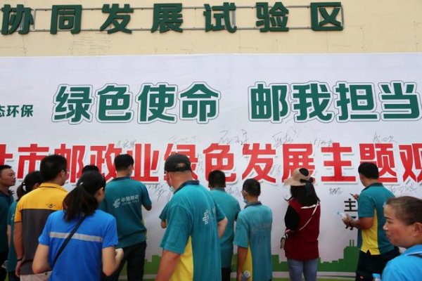 8月13日,快遞企業(yè)工作人員在安徽省淮北市郵政業(yè)綠色發(fā)展主題觀摩現(xiàn)場(chǎng)集中簽名。本報(bào)通訊員 萬(wàn)善朝 攝