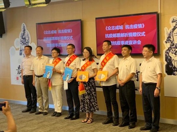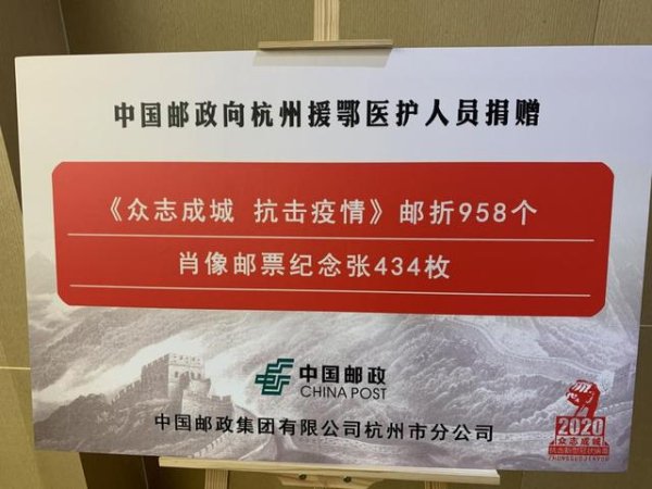 8月20日上午,在杭州郵政分公司大樓的報(bào)告廳,由杭州市衛(wèi)生健康委員會、杭州市市郵政管理局、杭州郵政分公司聯(lián)合舉辦《眾志成城 抗擊疫情》郵折捐贈(zèng)儀式。杭州郵政分公司向杭州援鄂抗疫醫(yī)務(wù)工作者捐贈(zèng)《眾志成城 抗擊疫情》郵票郵折共計(jì)958套;肖像郵票紀(jì)念張434張。此次捐贈(zèng)給醫(yī)務(wù)工作者的《眾志成城 抗擊疫情》紀(jì)念郵折,是中國郵政特別發(fā)行的郵票,用于銘記中國力量和中國精神,并將郵票發(fā)行收入捐獻(xiàn)用于救災(zāi)抗疫。