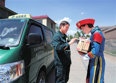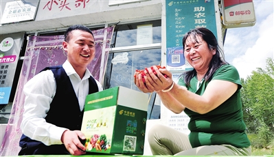 互助土族自治縣郵政分公司投遞員學(xué)習(xí)踐行“鴻雁天路”精神,圖為投遞員為南門峽鎮(zhèn)西坡村村民投遞包裹。