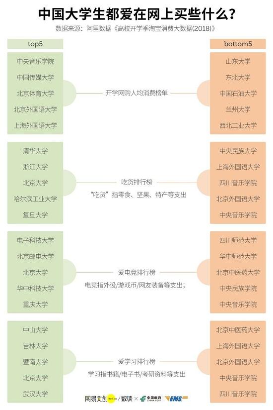 根據(jù)往年的數(shù)據(jù),大學(xué)開學(xué)季,中國高校大學(xué)生網(wǎng)購消費,往往會達(dá)到一個小高峰。阿里數(shù)據(jù)則顯示,開學(xué)網(wǎng)購人均消費高校榜單中,中央音樂學(xué)院、中國傳媒大學(xué)、北京體育大學(xué),以最高的人均消費排名前三。