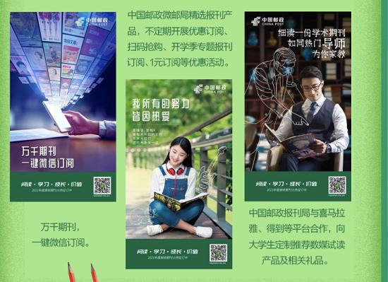 面對高校學(xué)生,還有各類文藝雜志、報刊優(yōu)惠訂閱服務(wù),萬千期刊,均能微信一鍵訂閱。中國郵政微郵局精選報刊產(chǎn)品,更是不定期開展優(yōu)惠訂閱、掃碼搶購、開學(xué)季專題報刊訂閱、1元訂閱等優(yōu)惠活動!甚至還聯(lián)合喜馬拉雅、得到等平臺,提供數(shù)媒試讀和相關(guān)禮品,可以說是誠意滿滿。
