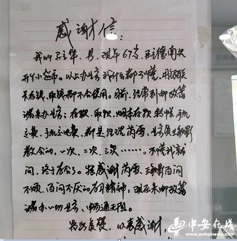 9月22日一大早,郵儲(chǔ)銀行亳州市立德鎮(zhèn)支行剛剛營(yíng)業(yè),一位老大爺匆匆走進(jìn)網(wǎng)點(diǎn)大廳,對(duì)工作人員說:“你們負(fù)責(zé)人在嗎?”還沒等工作人員回話,老大爺接著說:“我是來送感謝信的,感謝你們工作人員不厭其煩的教會(huì)我辦理各項(xiàng)業(yè)務(wù)?!边呎f老人邊從口袋里掏出一封手寫的感謝信。