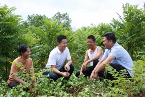 郵儲(chǔ)銀行四川省分行駐村幫扶干部吳鵬坤(左二)與種植戶溝通香椿種植