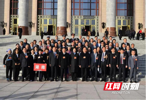 湖南省的“全國勞?!痹谌嗣翊髸?huì)堂前合影。
