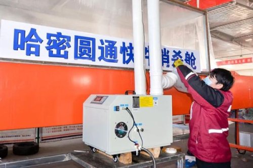 12月7日,哈密天順物流園內(nèi)的哈密圓通快遞公司分撥中心入口處,工作人員正在為消殺艙霧化機添加按規(guī)定配比的消毒液。記者李文龍攝