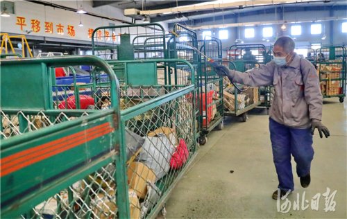 2021年1月7日,位于河北省秦皇島市海港區(qū)臨港物流園區(qū)的中國郵政集團有限公司秦皇島市分公司網(wǎng)路運營中心內(nèi),工作人員在對快遞包裹進行消殺。
