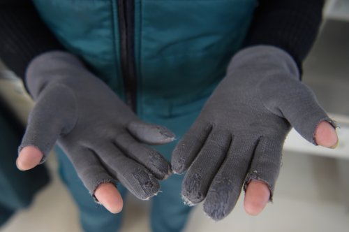 1月7日,韓金花在阿爾山市郵政分公司寄遞事業(yè)部展示自己的手套。